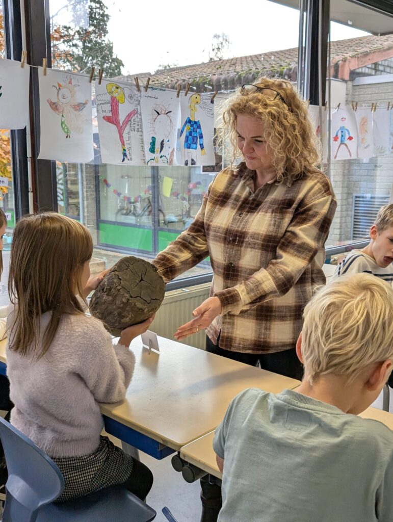 Op verzoek van een ouder en tevens leerkracht op basisschool de Driesprong in Geleen hebben vrijwilligers Miriam en Angelica op dinsdag 25 november 2025 een presentatie verzorgd aan de groepen HB 5 en HB 6 van basisschool de Driesprong in Geleen. Deze ouder en haar kinderen waren aanwezig bij een presentatie van de leskist “Verborgen Vondsten” bij de Archeo Hotspot in Centre Céramique